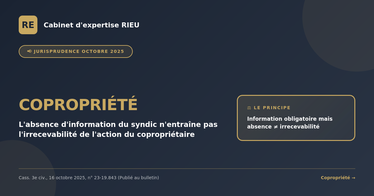 Action en justice du copropriétaire : l’absence d’information du syndic n’entraîne pas l’irrecevabilité (Cass. 3e civ., 16 octobre 2025)