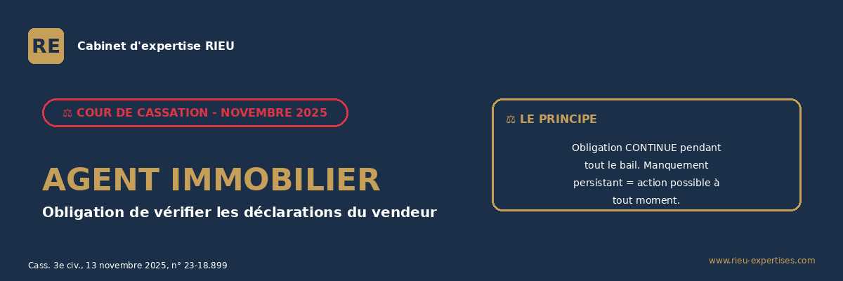 La Cour de cassation a rendu le 13 novembre 2025 une décision majeure qui renforce considérablement l’obligation de vérification pesant sur l’agent immobilier dans le cadre d’une transaction immobilière (Cass. 3ème civ., 13 novembre 2025, n° 23-18.899, cassation partielle).